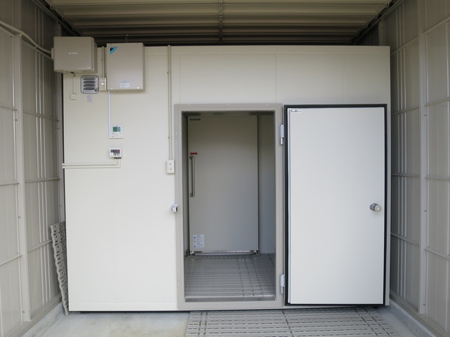 右の写真、奥側の白いものが当社の氷温庫(高性能プレハブ冷蔵倉庫)です。(手前側シルバーのものが他社製の既製品の冷蔵庫)